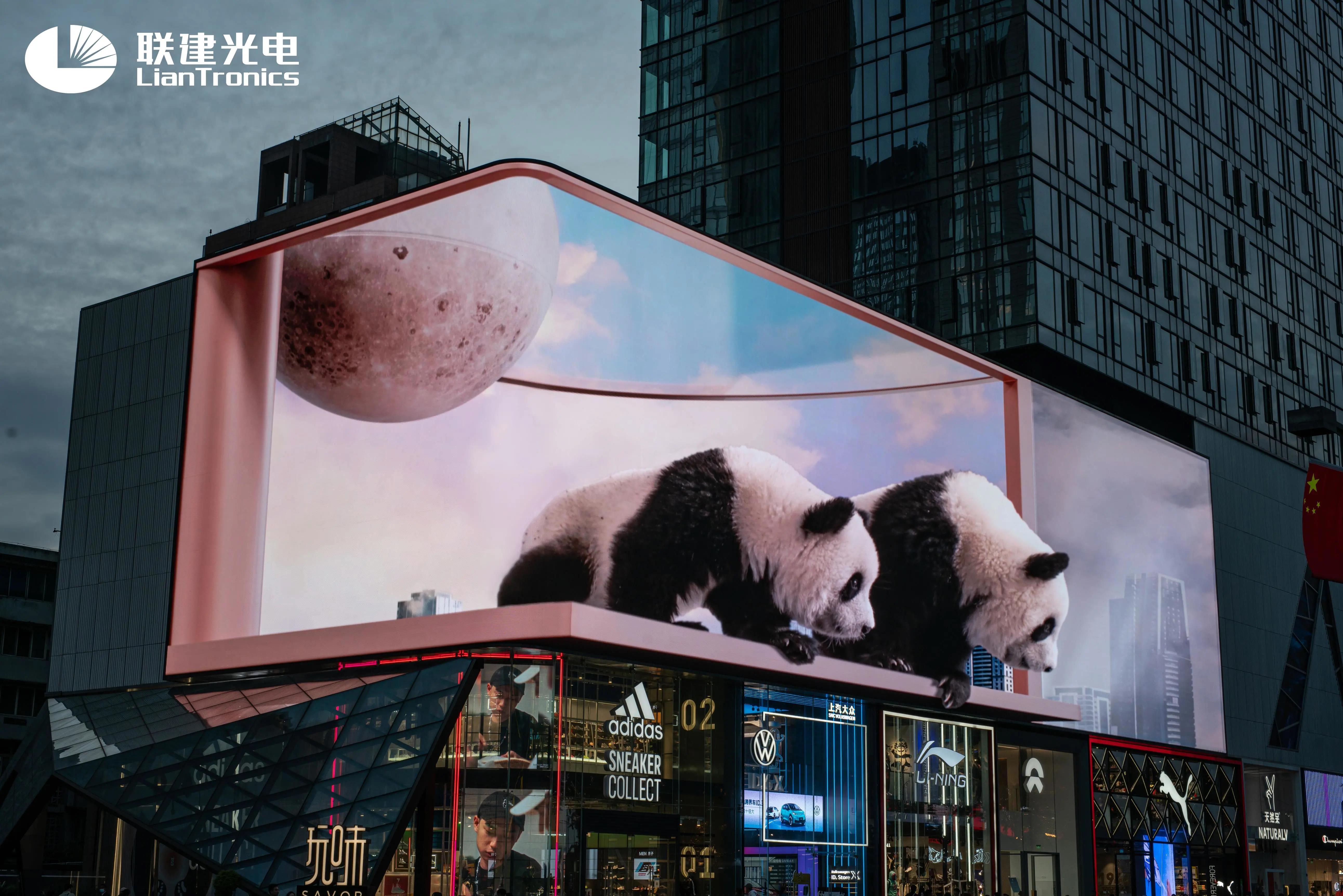就像在韩国提到裸眼3D,大众想到的一定是首尔江南区的“Wave”装置一样,在中国,提到裸眼3D大屏,大多数人想到的,一定是由联建光电打造的,位于成都太古里盈嘉大厦的裸眼3D巨幕。这块“网红大屏”采用户外高亮广角显示、超高对比吸光面罩等先进技术和联建光电专利弧形转角技术,自2020年国庆前夕点亮后,已在全球范围内,创造了远超10亿的曝光量。逼真的显示效果,配合多种创意内容,引爆了“成都太古里裸眼3D大屏”、“灵笼成都太古里裸眼3D”、“王一博亮相成都裸眼3D大屏”等多个公共话题,成为当之无愧的网红地标。