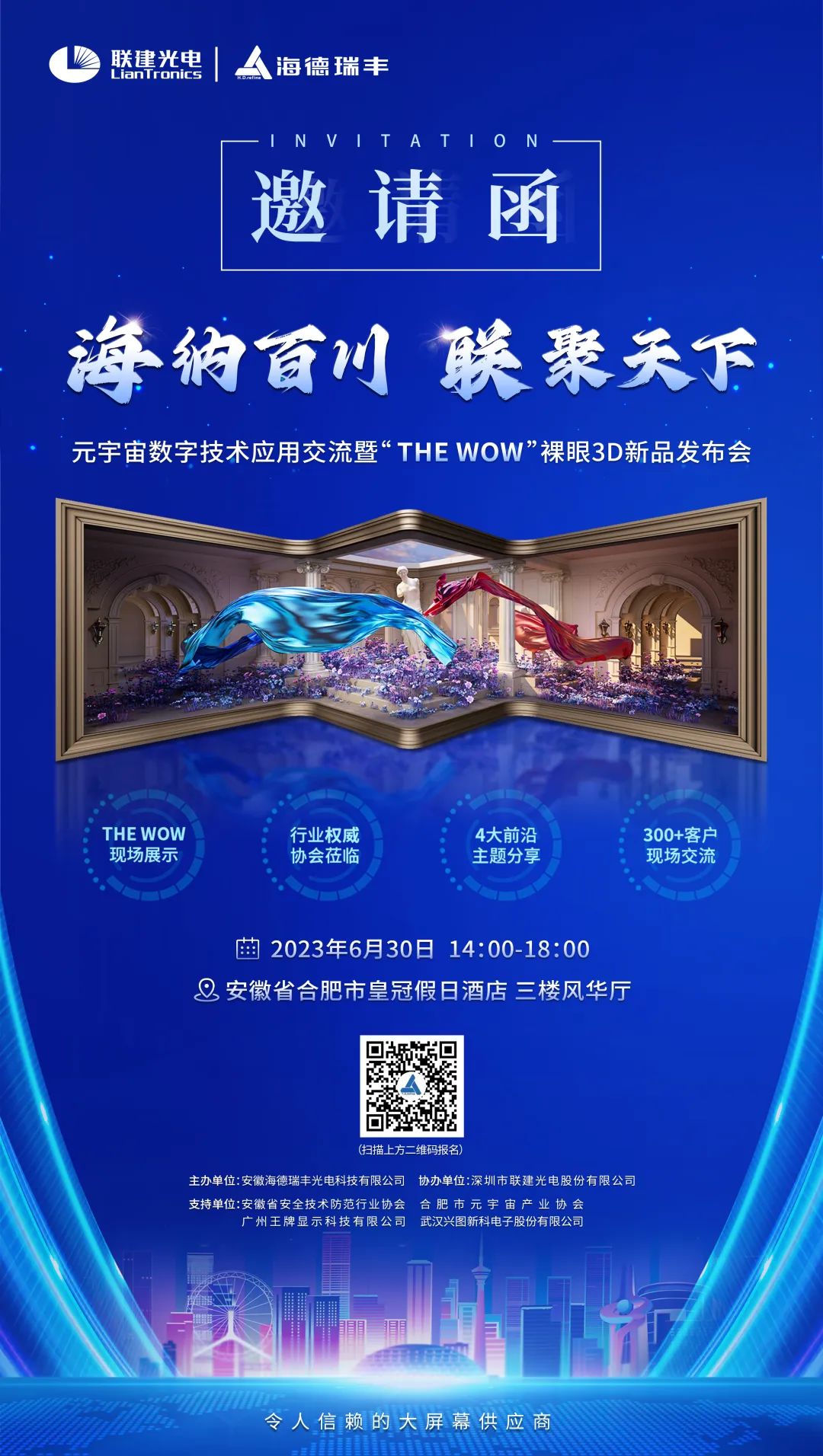 安徽一直是联建光电华中大区的重要区域,6月30日,联建光电&海德瑞丰“海纳百川 联聚天下”元宇宙数字技术应用交流暨“THE WOW”裸眼3D新品发布会将会在安徽合肥隆重举行,届时将会现场鉴证“THE WOW”裸眼3D方案的震撼效果,欢迎各位莅临指导。